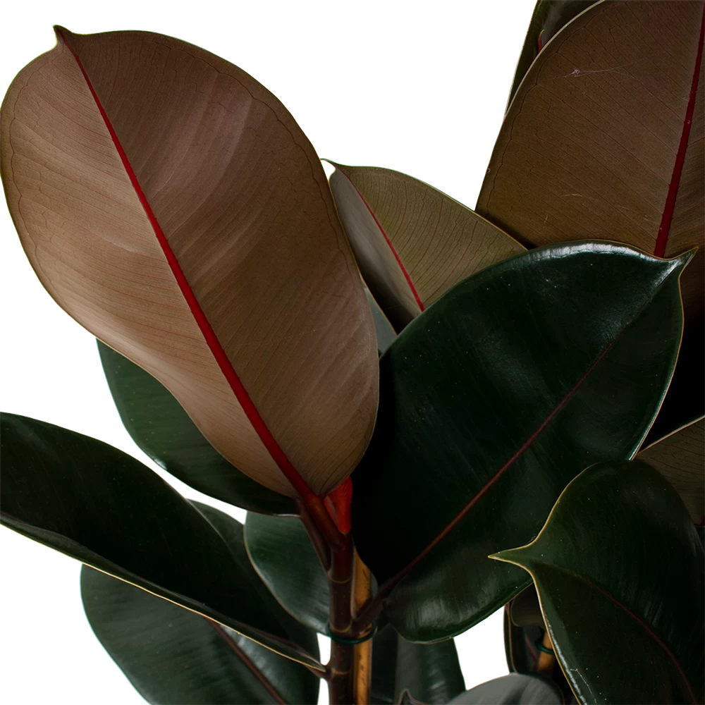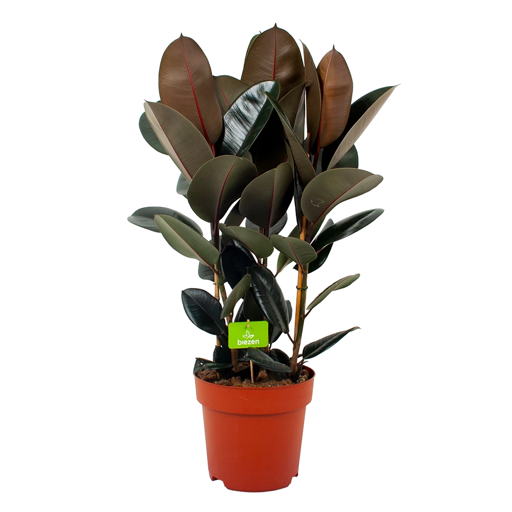 Ben je op zoek naar een sterk luchtzuiverende kamerplant? Ga dan voor de Ficus Elastica Abidjan, die naast nuttig ook een mooie blikvanger is. De ovaal donkergroene bladeren van deze plant hebben een opvallende rode nerf en glimmen flink. Plaats de Ficus Elastica Abidjan op een lichte plek met indirect zonlicht zo’n 2 meter van het raam. Geef de plant regelmatig water en houd de grond licht vochtig tussen het water geven door.