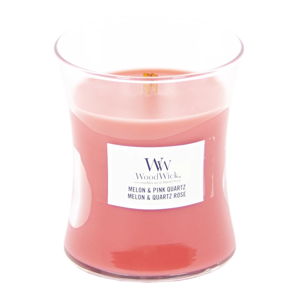 De geurkaars Melon & Pink Quartz van Woodwick heeft een zonovergoten geurcombinatie van meloen, komkommer en kristallijne roze kwarts, getraceerd met violet blad en citroenbloesem.